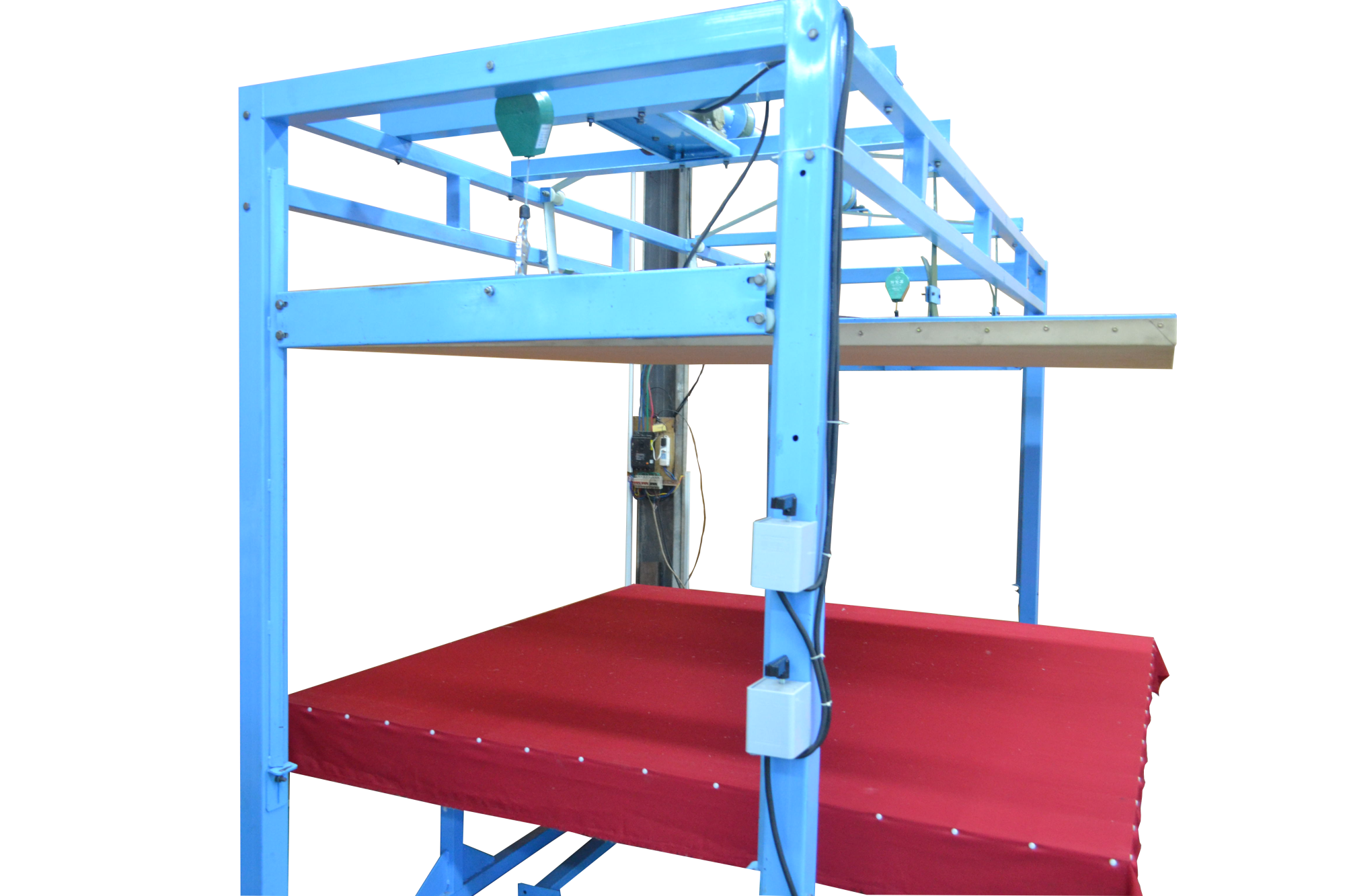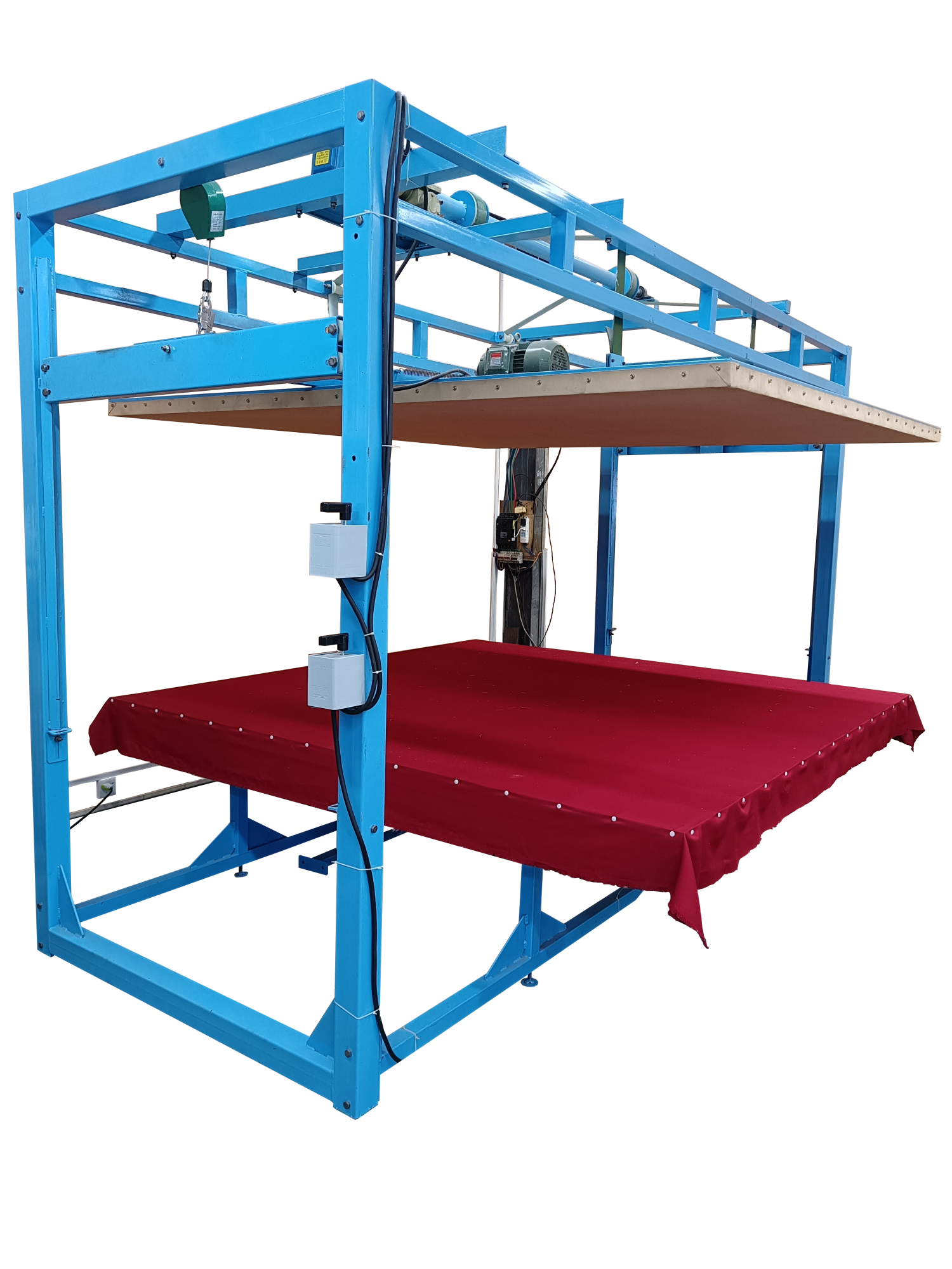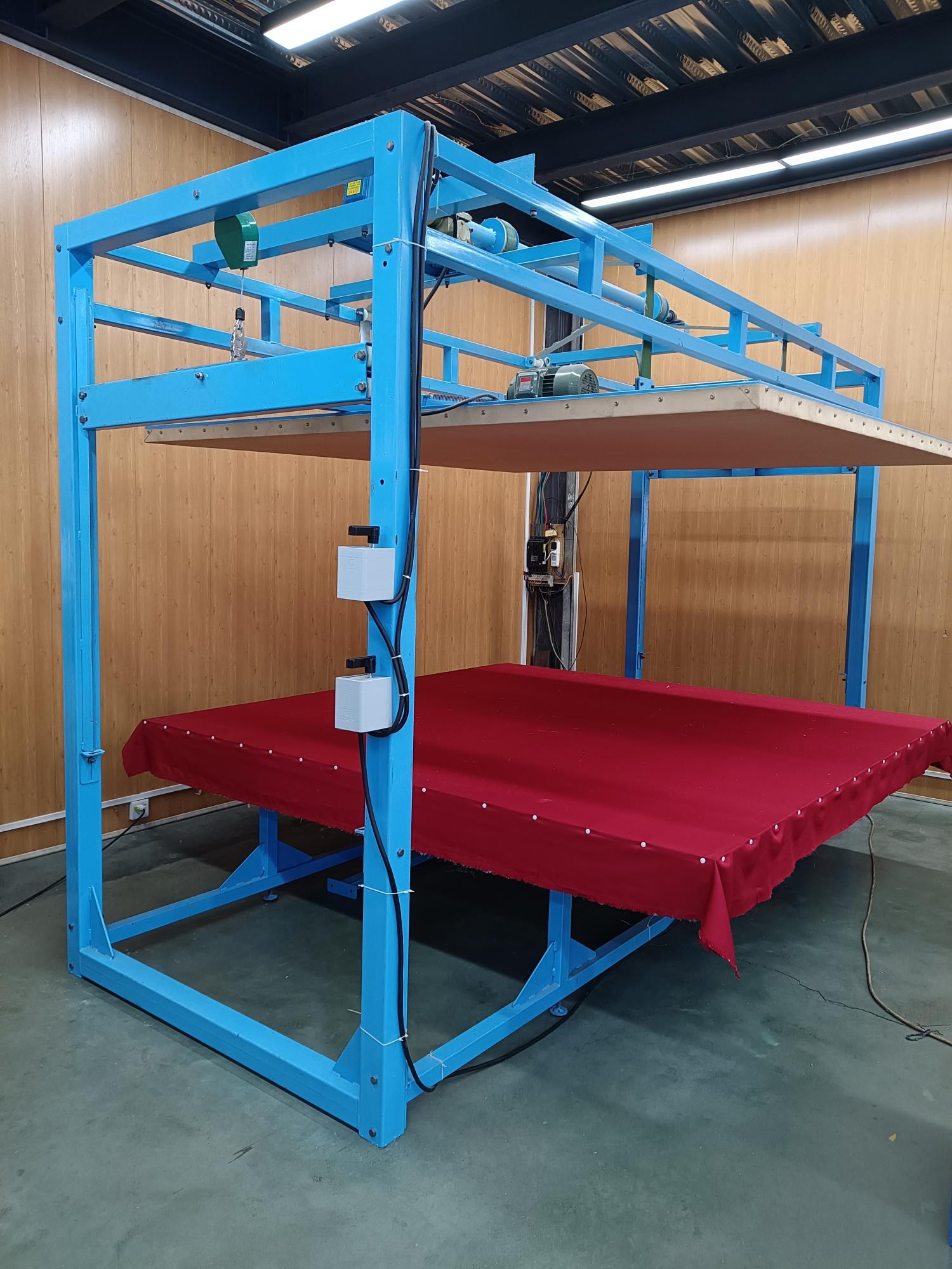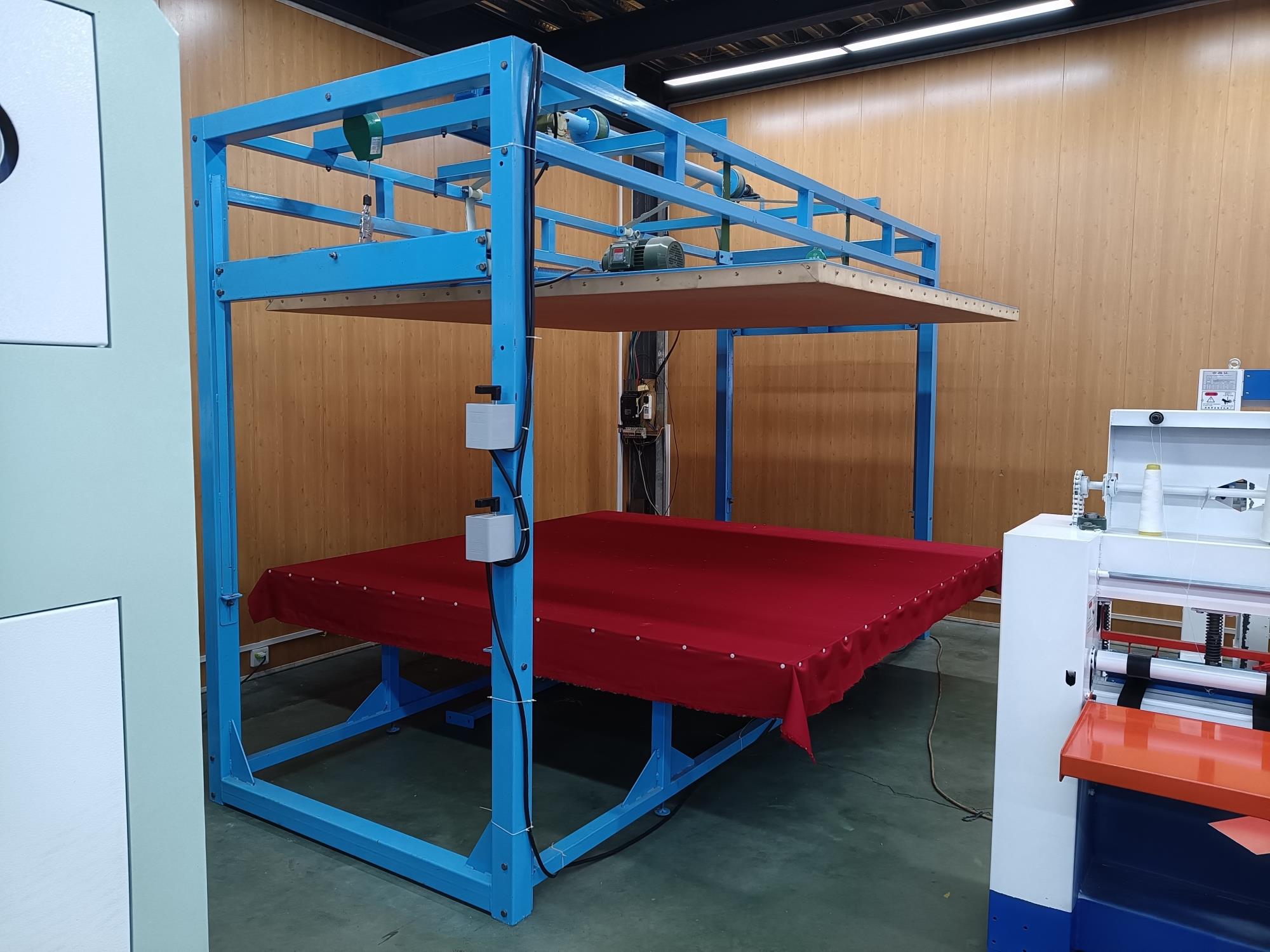 本全自動揉棉機(jī)為徽星機(jī)械機(jī)械制造有限公司研發(fā)新型產(chǎn)品,該全自動揉棉機(jī)由傳統(tǒng)的上傳動方式,改為下傳動方式。上傳動全自動揉棉機(jī)的主要缺點(diǎn)是噪音高,振動副度比較大,安裝時要配合地錨來固定機(jī)器,本新型機(jī)器(全自動揉棉機(jī))的下傳動裝置改變了以上的缺點(diǎn)。新一代全自動揉棉機(jī)(揉磨機(jī))操作方便,易于使用。適用于棉胎成型加工廠、踏花被廠、棉胎加工個體戶使用;全自動揉棉機(jī)揉制的棉胎(絮)平整、美觀、結(jié)實(shí)、耐用,全自動揉棉機(jī)(揉磨機(jī))使傳統(tǒng)的人工強(qiáng)體力勞動變?yōu)楸鞠盗袡C(jī)器的自動化機(jī)械作業(yè),特別是自動升降系統(tǒng)和定時揉棉設(shè)定,大大減輕了工人的勞動強(qiáng)度、提高了勞動效率。并且一人可看管多機(jī),效益非常顯著。全自動揉棉機(jī)其原理是電機(jī)帶動偏心運(yùn)轉(zhuǎn)使上揉板運(yùn)動,將棉鋪磨平、壓緊,使棉纖維與網(wǎng)線結(jié)合,成型棉胎。